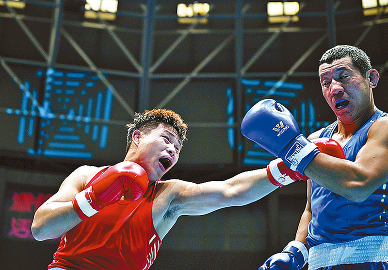 11月14日,韩雪振(左)与孟繁龙在比赛中。当日,在广东深圳进行的第十五届全国运动会拳击男子92公斤级决赛中,河南队选手韩雪振战胜北京队选手孟繁龙,夺得冠军。 新华社记者 杨冠宇 摄