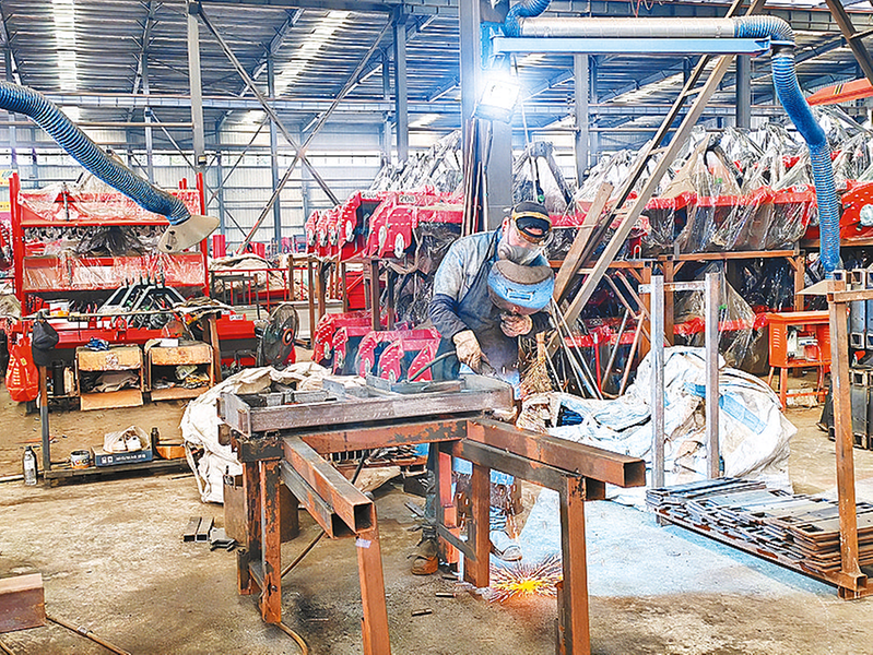 近日,在河南农有王农业装备科技股份有限公司车间,工人正在加紧生产订单产品。