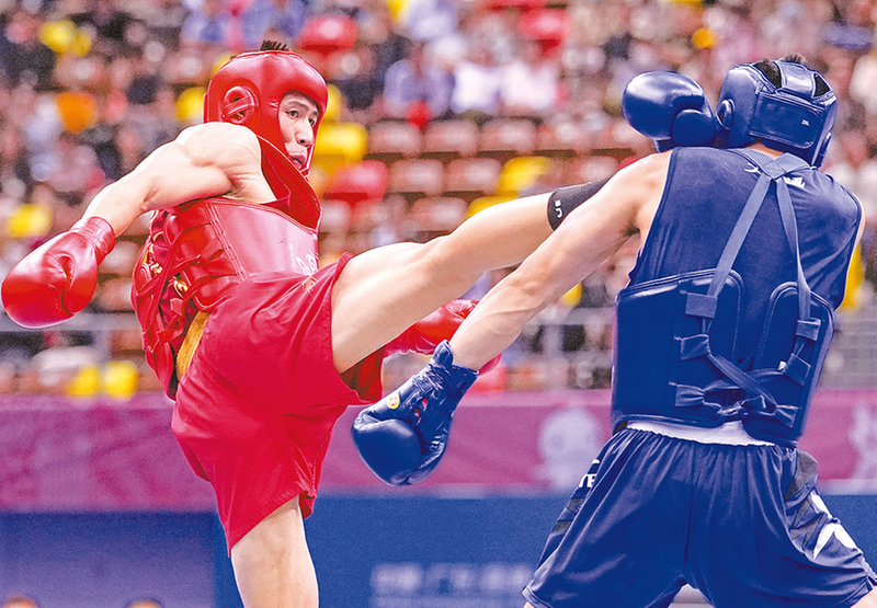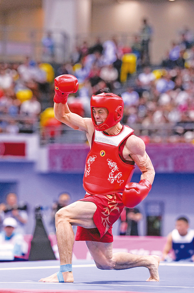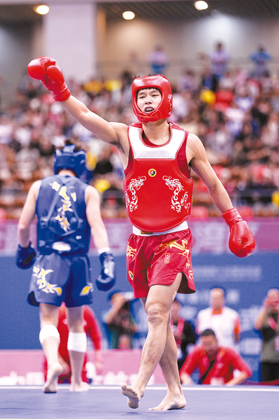 11月16日,河南队选手申国顺在56公斤级比赛中庆祝。他2比0战胜山东队选手张井民。新华社记者 李 博 摄 新华社湛江11月16日电(记者 郑家宝 杨淑馨)第十五届全国运动会武术散打比赛16日在湛江奥体中心体育馆收官,决出全部五枚金牌,河南队斩获三金成为“最大赢家”。