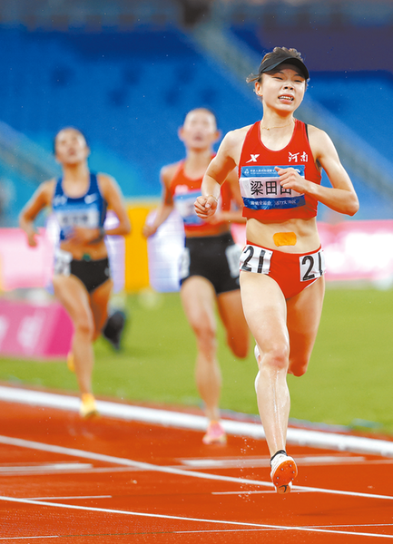 11月18日,河南队选手梁田田(右)在比赛中冲刺。她夺得冠军。当日,第十五届全国运动会田径项目女子5000米决赛在广州举行。新华社记者 黄 伟 摄