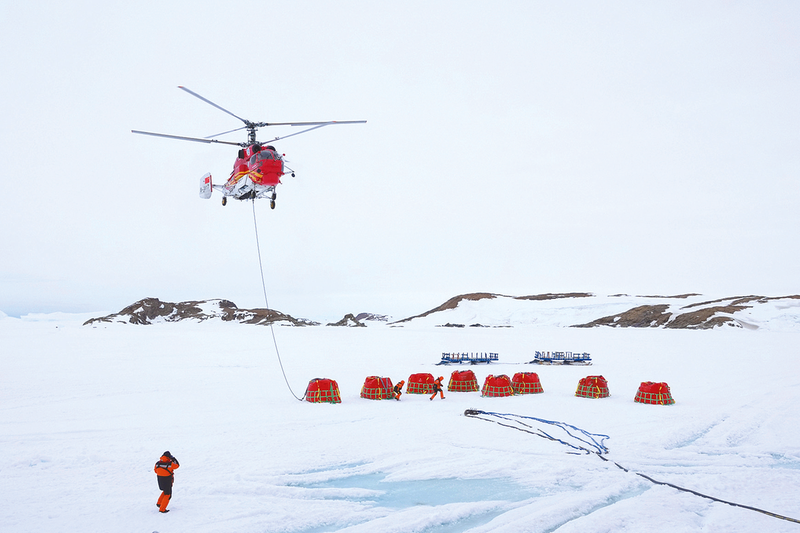近日,正在执行中国第42次南极考察任务的“雪龙”号抵达南极中山站外围陆缘冰。“雪龙2”号已于北京时间11月25日率先抵达该区域。两船正协同开展中山站区域大规模卸货作业。本次作业将累计完成约2000吨各类物资卸运。按计划,整体卸货作业将持续约15天。据“雪龙2”号轮机长李文明介绍,“雪龙2”号是首次为考察站补给燃油。 北京时间12月2日傍晚,“雪鹰102”直升机从“雪龙”号甲板飞至“雪龙2”号船侧冰面作业点,开启油囊吊挂作业。