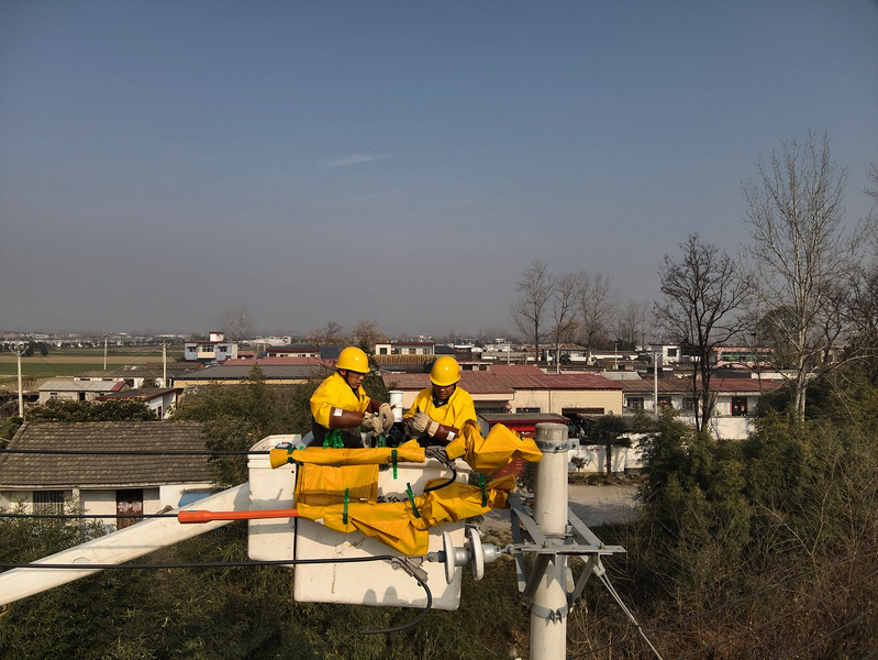 12月10日,在确山县普会寺镇10千伏米供4线路作业现场,国网确山县供电公司带电作业班工作人员身穿防护服,在绝缘斗臂车里有条不紊地开展带电消缺作业。