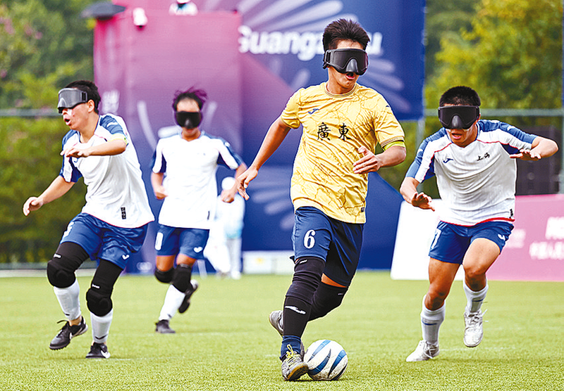 12月12日,广东二团队球员林显晴(右二)在比赛中带球突破。当日,在广州举行的全国第十二届残疾人运动会暨第九届特殊奥林匹克运动会盲人足球项目男子组小组赛中,广东二团队4比3战胜上海队。新华社记者 陈浩明 摄