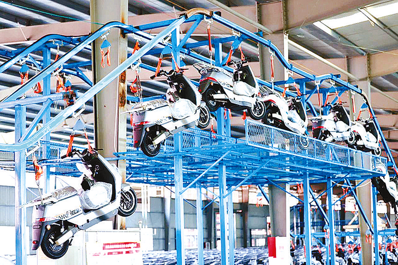 近日,在位于汝南县先进制造业开发区的立马电动车科技有限公司车间,立体化的生产线高速运转,空中的吊臂将车架、外壳等精确运送到每个工位,现场呈现一派繁忙的生产景象。
