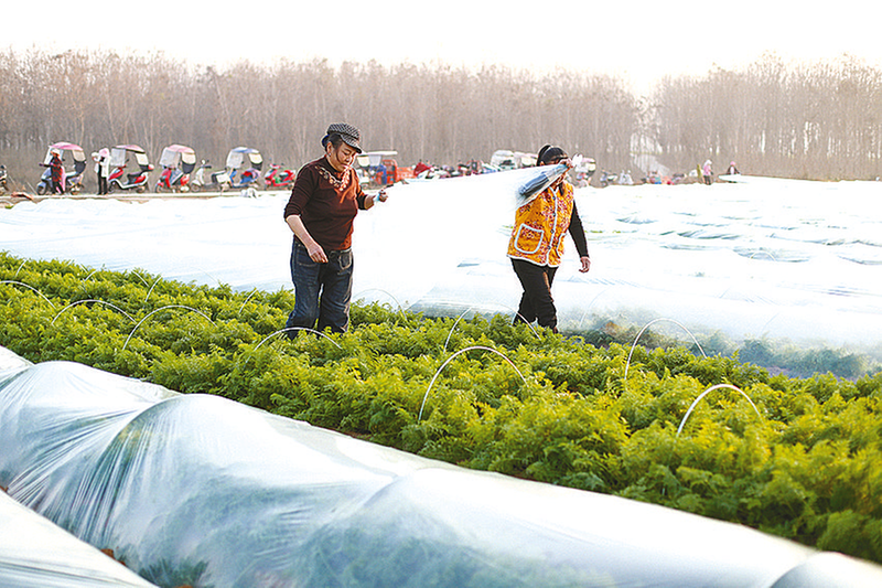近日,正阳县大林镇十门村村民抢抓农时,为320亩红萝卜覆盖薄膜,有序开展冬季农业生产。