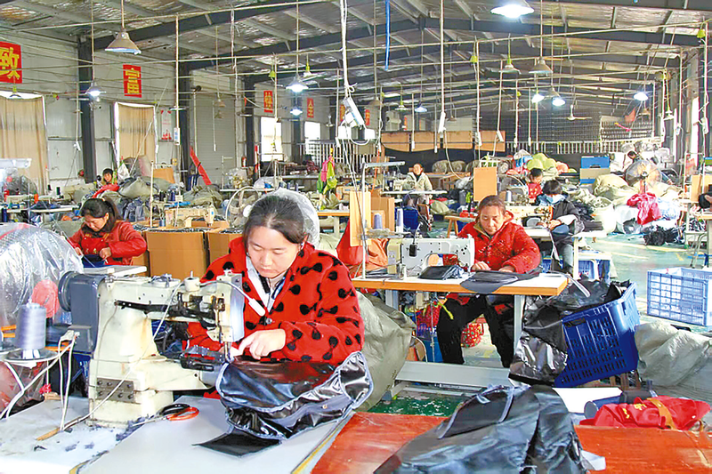 近日,在新蔡县李桥回族镇狮子口村产业园区的河南看远箱包厂生产车间,缝纫机轰鸣声不绝于耳,20多名熟练工人正用灵巧的双手加班加点赶制一批箱包订单,呈现一派繁忙的生产景象。