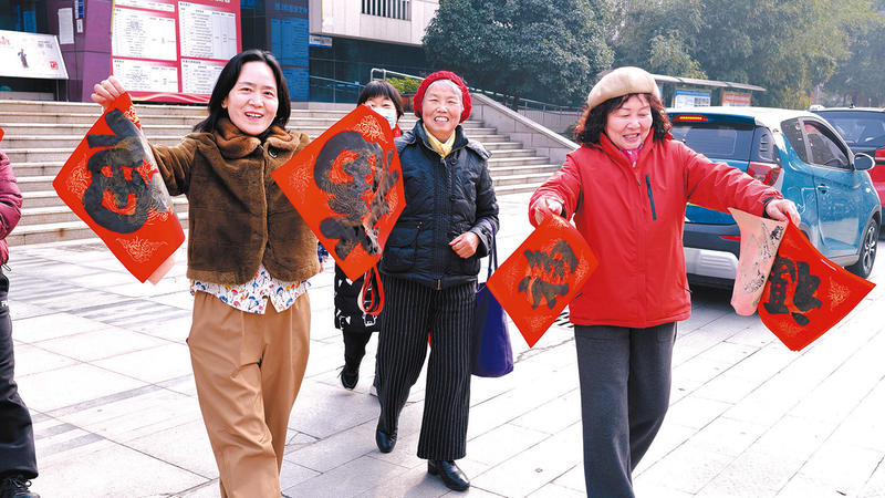 展览精选100件书画作品,聚焦“文化传承”与“时代叙事”双主线。既有深耕盘古开天、蔡国故都、梁祝传说等地域文化根脉的经典创作,又有描绘乡村振兴、城市蝶变、民生百态的鲜活图景。现场求取“福”字与春联的人排成小队。也有不少书法爱好者在老师指导下临摹吉语、书写心愿,现场笑语阵阵,纸墨生香。