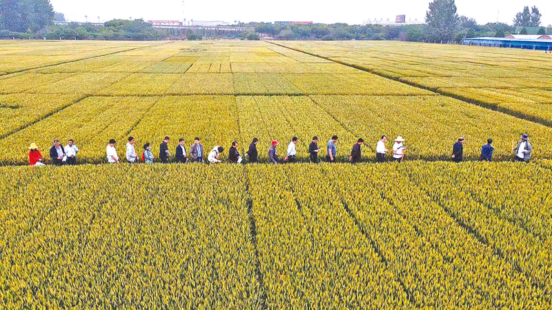 农科院专家在试验基地检查小麦田间试验。
