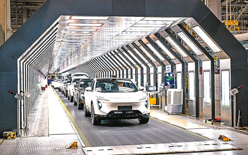 2025年9月18日在位于重庆市渝北区的长安汽车数智工厂总装车间拍摄的即将下线的新能源汽车。 新华社记者 王全超 摄 新华社记者