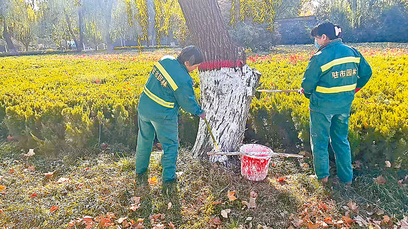 近日,市园林绿化中心抢抓当前天气晴好有利时机,组织开展“树木涂白”冬季绿化养护工作,以精细化管理为手段助力绿化树木御寒安全越冬,提升冬季景观效果。该中心工人严格按照树木养护规范标准,把控每一棵树木涂白高度与涂层均匀度,确保涂白药剂全面覆盖树干,无遗漏、无死角。本次冬季绿化养护工作累计投入人力300人次,投放涂白剂、石硫合剂计150多袋,完成树木涂白5000多棵。