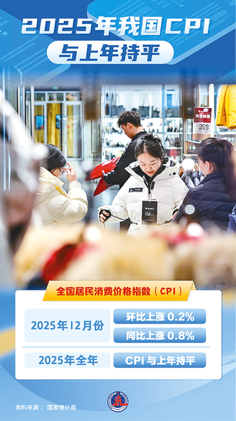国家统计局2026年1月9日发布数据显示,2025年12月份,全国居民消费价格指数(CPI)环比上涨0.2%,同比上涨0.8%;工业生产者出厂价格指数(PPI)环比上涨0.2%,同比下降1.9%。2025年全年,CPI与上年持平;PPI下降2.6%。