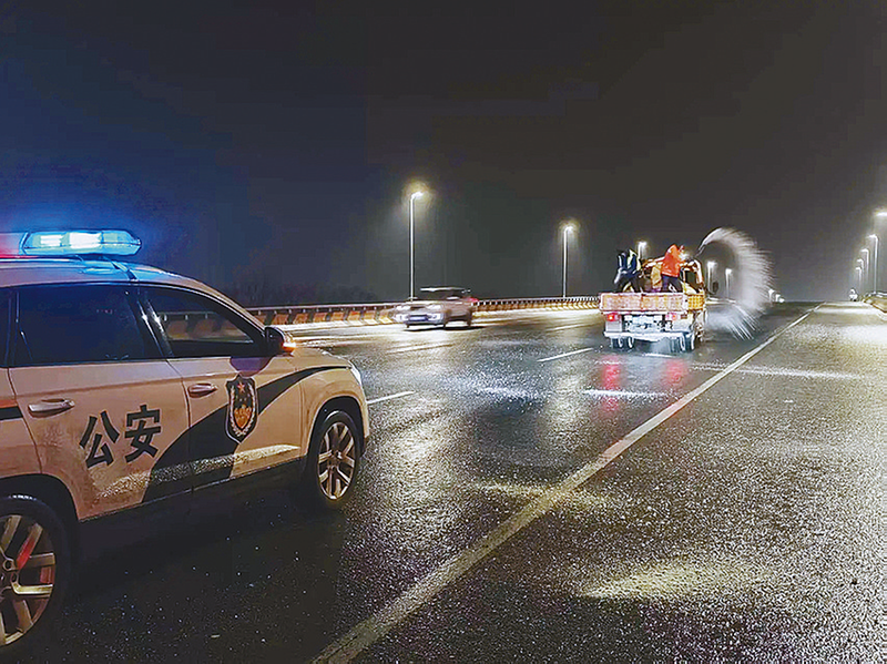1月18日晚至19日,市区遭遇冰冻雨雪天气,部分路段湿滑结冰,存在交通安全隐患。市公安局交通警察支队迅速启动应急预案,强化重点路段和易结冰区域巡逻管控,高频次排查隐患,快速处置事故与拥堵,及时帮扶受困群众及车辆。同时,协同城管、路政、环卫等部门,调配除雪车、撒布机等装备,开展融冰除雪作业。
