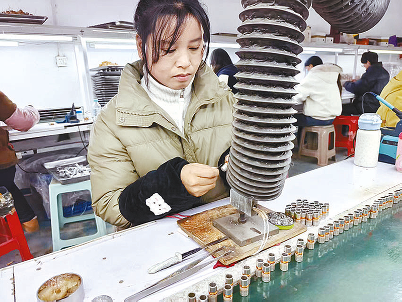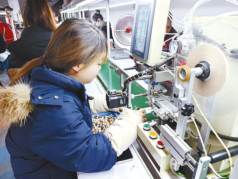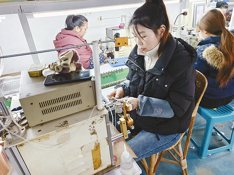 近日,走进泌阳县官庄镇欣声电子厂,车间内机器轰鸣,工人正加紧组装、检测电子元器件,呈现一派繁忙景象。