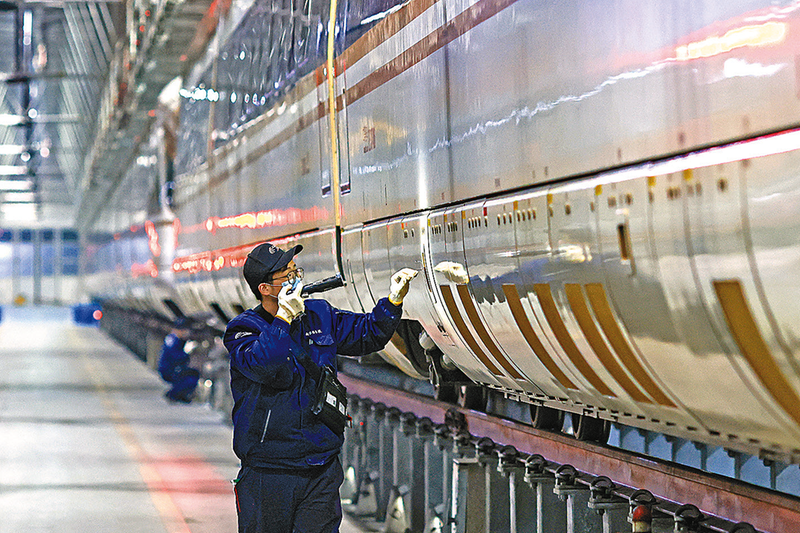 1月27日晚,工作人员在南京南动车运用所检修动车组列车。新华社发