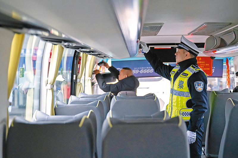 1月29日,在湖北省武汉市宏基长途客运汽车站,武汉交警对长途汽车进行安全检查。 新华社记者 伍志尊 摄 新华社记者 叶昊鸣 王聿昊