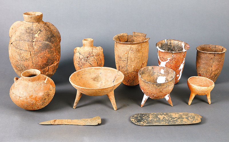 河南新郑市裴李岗石器时代遗址西部墓葬区M85出土的器物组合(资料照片)。