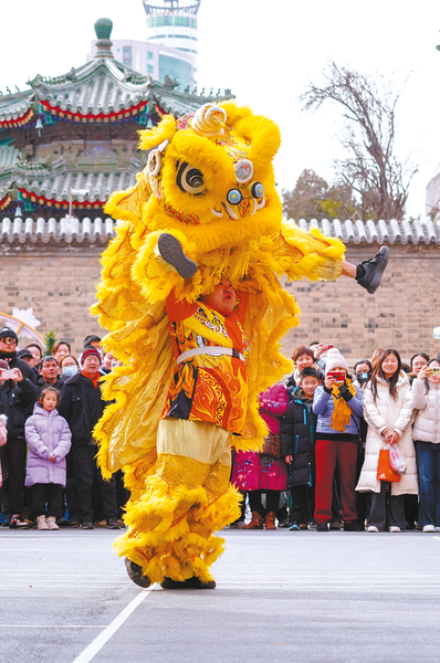 2月10日,民俗表演爱好者在济南上新街表演舞狮。新华社记者 徐速绘 摄