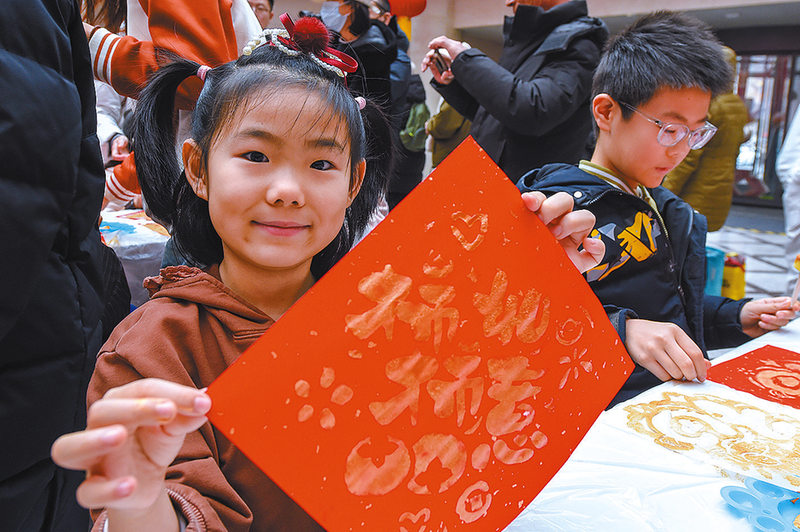 2月10日,在长春市图书馆,小朋友展示创意福字。