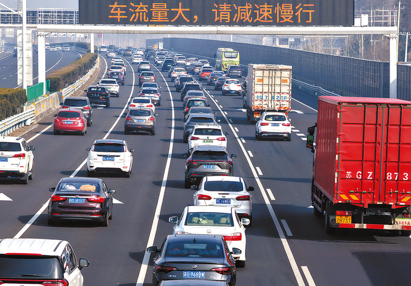 2月15日,车辆行驶在京沪高速江苏扬州段(无人机照片)。