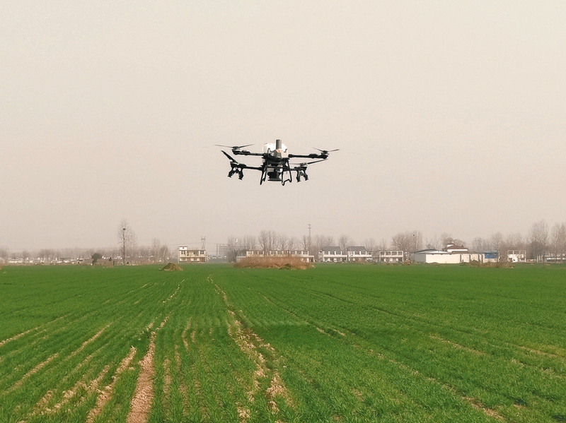 2月23日,正阳县清源街道黄磊家庭农场技术人员正在使用无人机,为小麦施肥。“雨水”节气过后,气温回升,小麦迎来返青拔节期,当地群众抢抓时机,施肥、除草,掀起春管高潮。