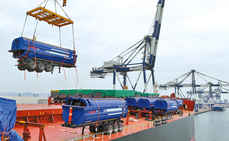2月24日,在山东港口烟台港,工人将出口卡车吊装上船(无人机照片)。 新华社发