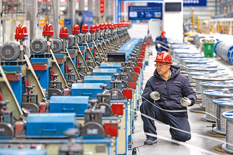 2月24日,工人在位于江苏省泰州市海陵区的江苏金桥焊材科技有限公司生产线上忙碌。