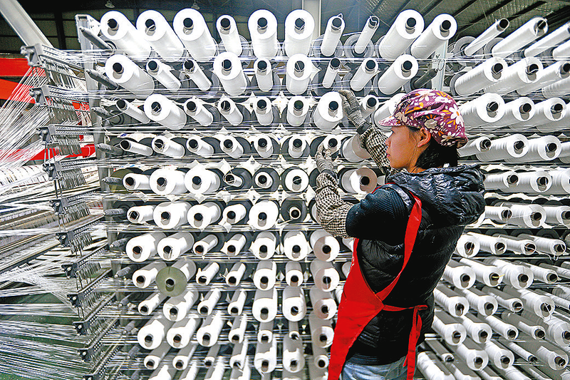 2月24日,在江苏省连云港市连云区一家编织袋生产企业,工人忙着赶制订单产品。