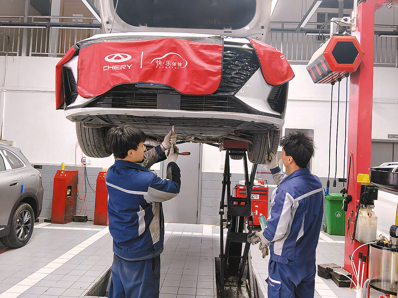 春节过后,不少车主为爱车进行全面“体检”,及时消除安全隐患,保障出行安全。图为奇瑞驻马店君鑫4S店工作人员正在为车辆进行检测。