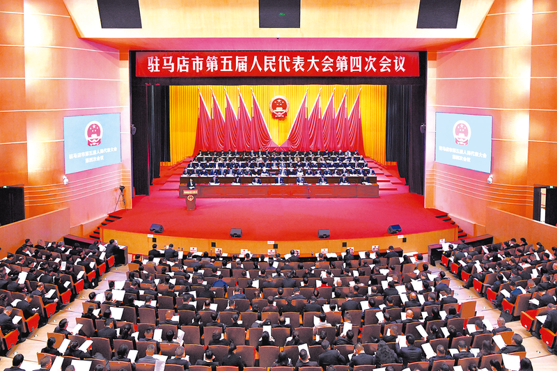 2月28日上午,驻马店市第五届人民代表大会第四次会议在驻马店国际会展中心隆重开幕。本报记者 谭 啸 摄 本报讯(记者 滑清泉 周 由)2月28日上午,驻马店市第五届人民代表大会第四次会议在驻马店国际会展中心隆重开幕。