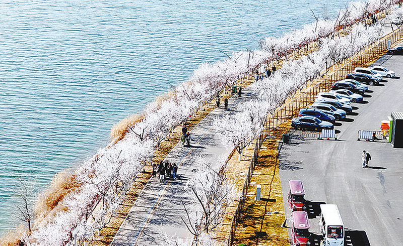 3月16日,游客在河北省石家庄市滹沱河畔赏花游玩(无人机照片)。