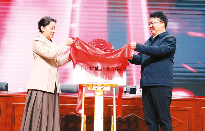 9时20分,现场最激动人心的时刻到了。熊蓉和李柯走到台前,一起为具身智能产业学院揭牌。红色的绸缎慢慢落下,金色的牌匾在灯光下闪闪发亮,相机的快门声与热烈掌声交织回响,记录下这一重要时刻。