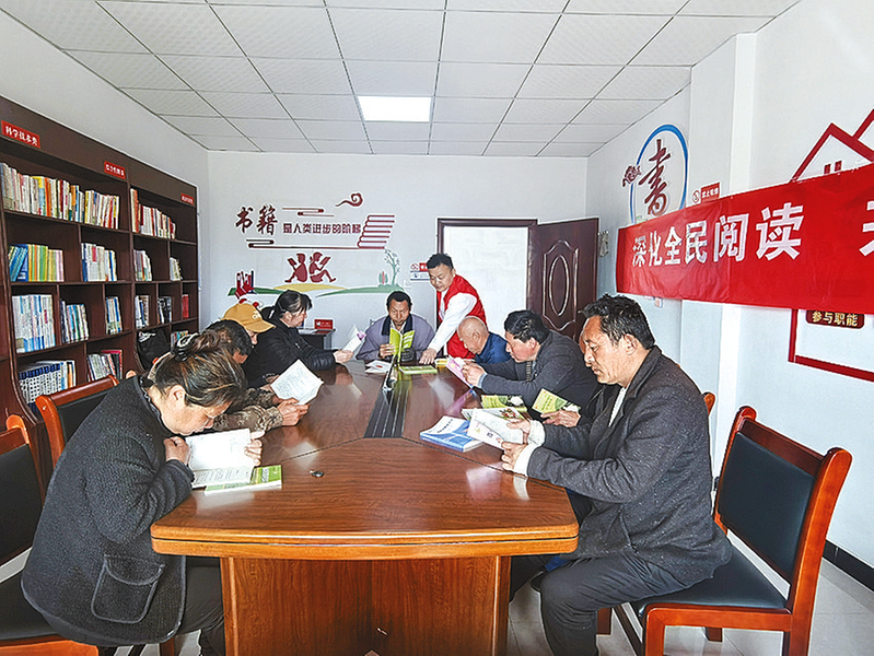 村民在书屋阅读。 4月的豫南大地,麦苗拔节,油菜结荚,田野间一片生机盎然。4月10日,记者走进驻马店市驿城区朱古洞乡窑后村农家书屋。书架上,一排排图书整齐排列;书桌前,几位村民一边翻看小麦病虫害防治手册,一边小声交流。