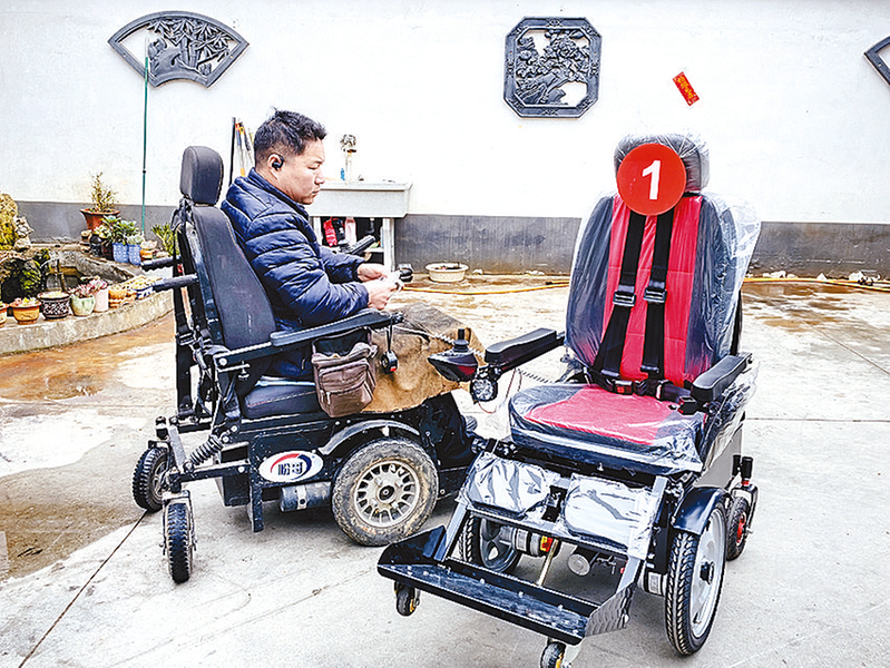 邵盼盼展示他自制的轮椅。 本报记者 许 静 文/图