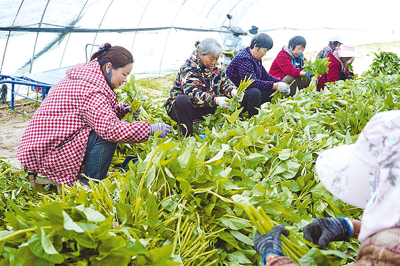 4月22日,在正阳县新阮店乡万马村蔬菜种植基地内,工人正在种植甜瓜、收获空心菜,呈现一派繁忙景象。